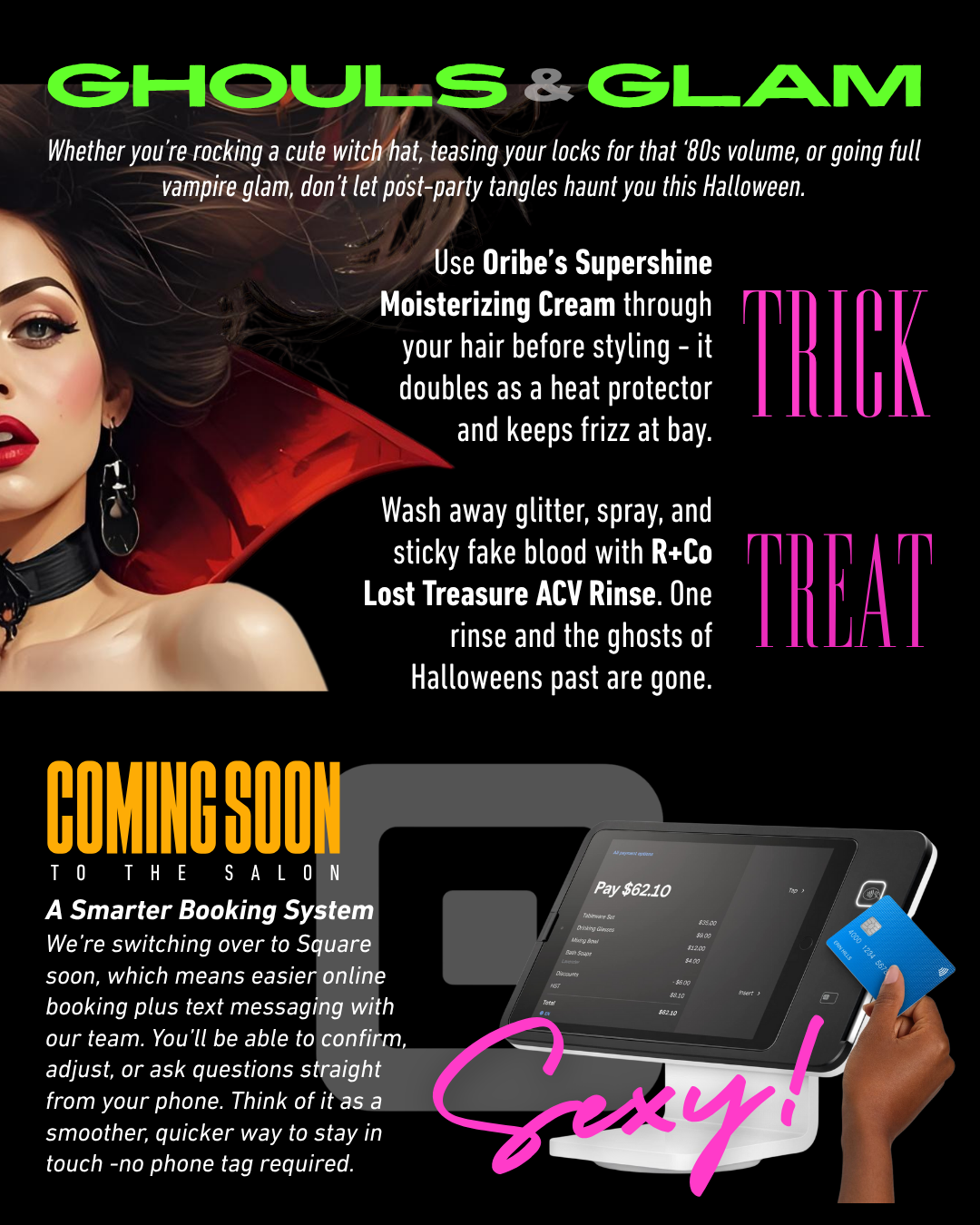 Halloween hair made easy at Euphoria 158. Protect with Oribe Supershine Moisturizing Cream and reset with R+Co Lost Treasure Cleansing Rinse. Style strong and keep your look fresh through every October event.